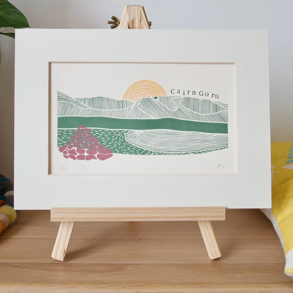 I work from my home studio in Elgin with an assortment of tools I have collected over the years including my wooden A3 Hand Printing Press. I enjoy walking and exploring the British coastlines and Scottish hills, fuelling my printmaking inspirations.